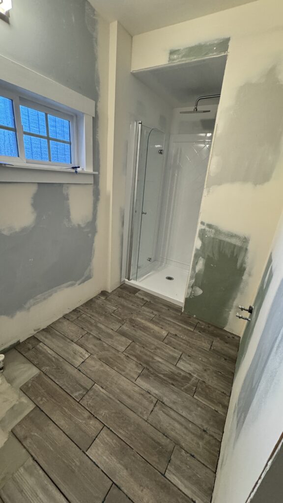 Shower, toilet, sink, flooring, and walls into the bedroom closet.
